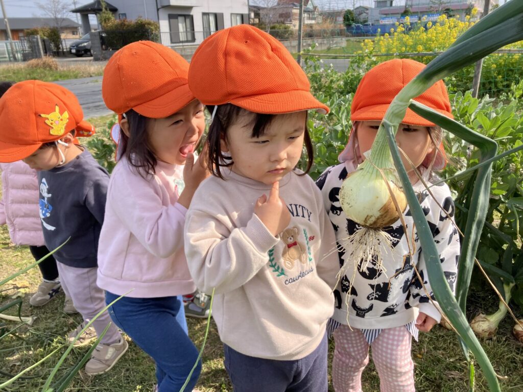 「なんだろう??」と考えていると思いきや、においを嗅ぐと「くさい!」と獲れたのて新玉ネギの感想を素直に教えてくれました。