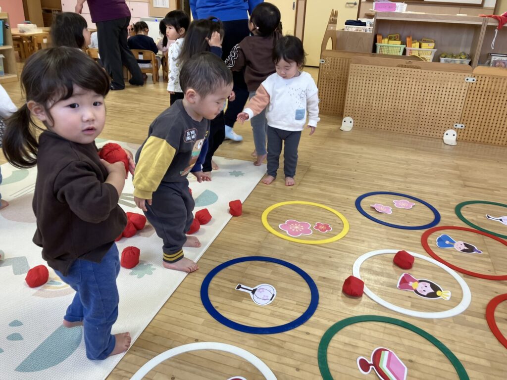 的玉入れに挑戦!フープの中にお雛様たちがいるよ。よく見てソレッ!!フープに入ったかな?
