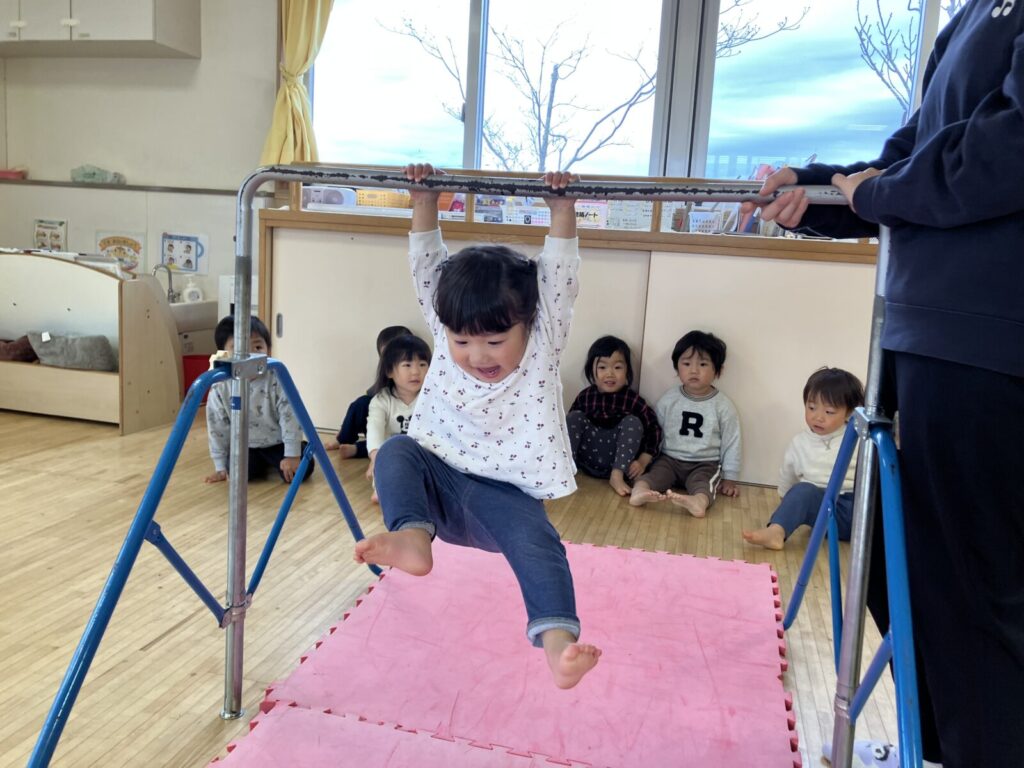 鉄棒ぶら下がりも足を浮かせて出来るようになったね!!
