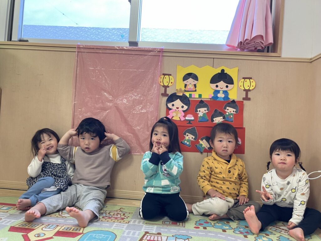 お雛様とお内裏様たちがあちこちにかくれんぼ?!みんなで見つけてペタッ!あれ?三人官女?お雛様??場所あってるかなぁ?全部見つけたね!一緒にハイ、ポーズ☺