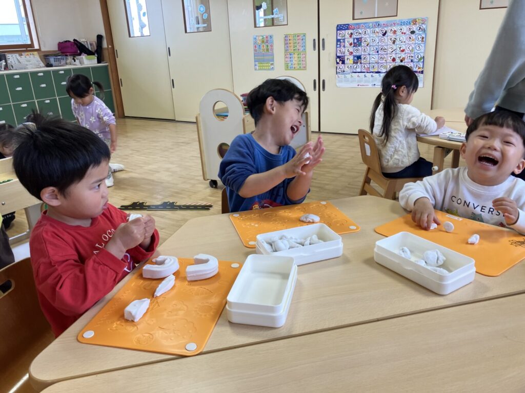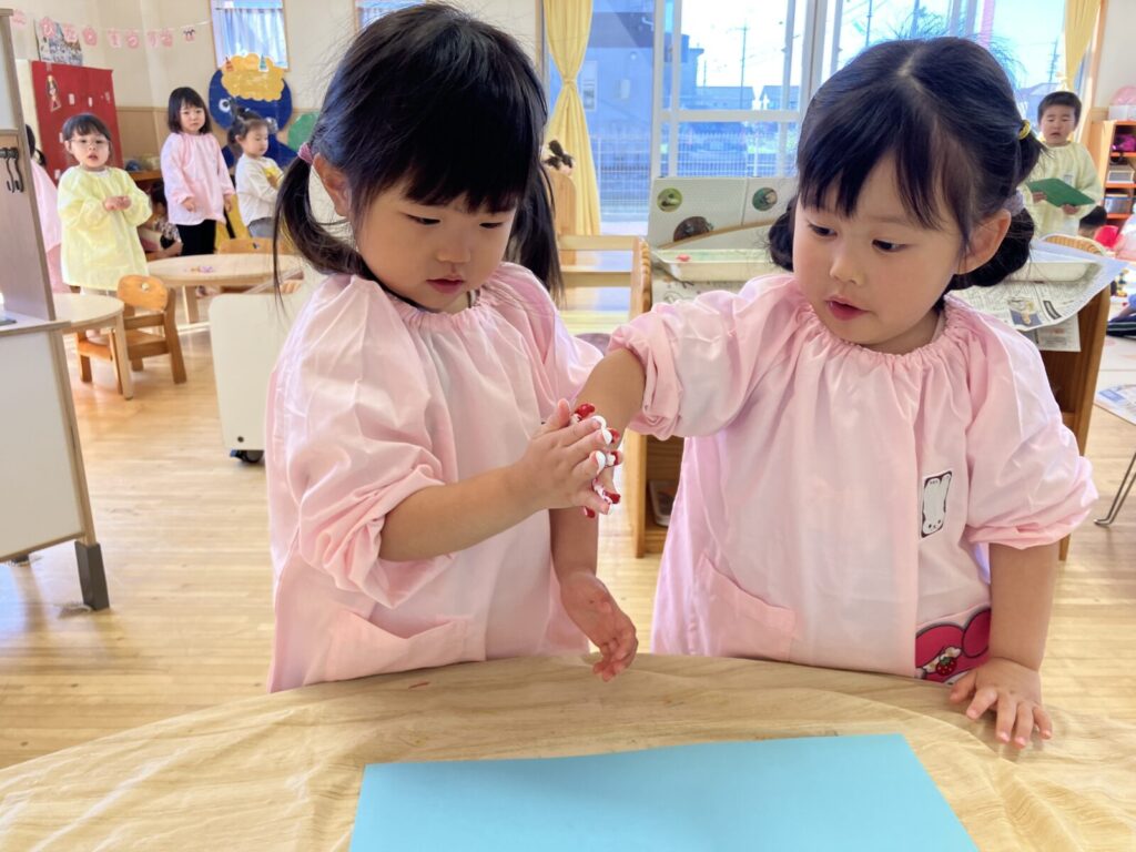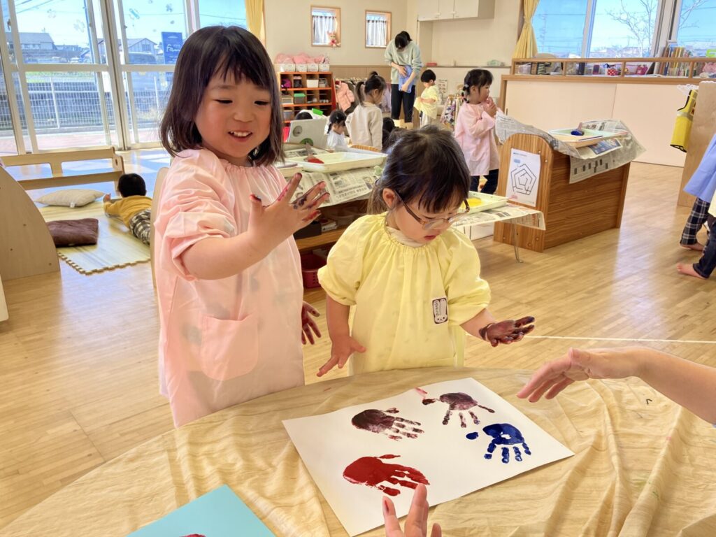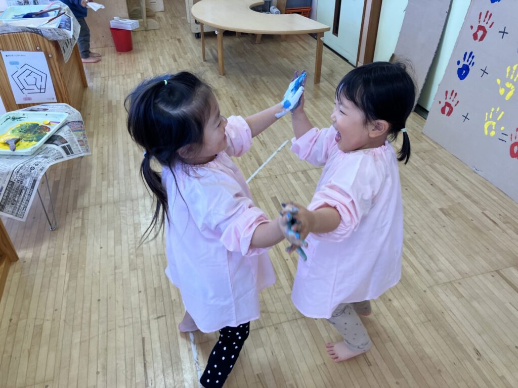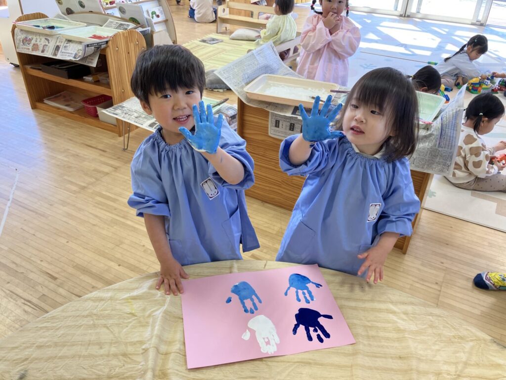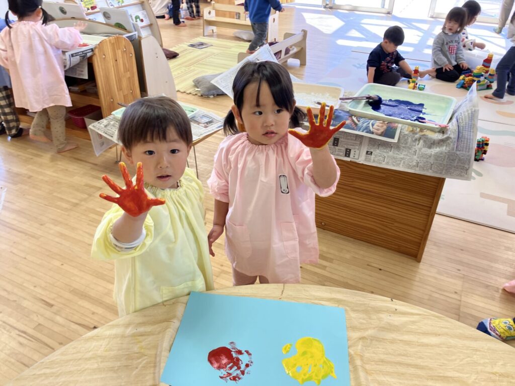 「♪赤、白、混ぜたら混ぜたら何色なるかな?」と歌に合わせてお友達と手を合わせ、手に付けた絵の具の色が変わる様子や、お友達と手を合わせる楽しさに笑顔がいっぱい👍楽しく遊んだ子どもたちです。