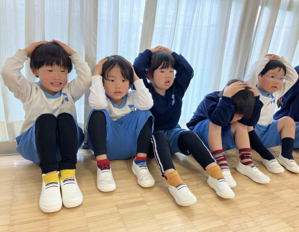 頭に手をのせて、先生が読む言葉をよ~く聞いています👂