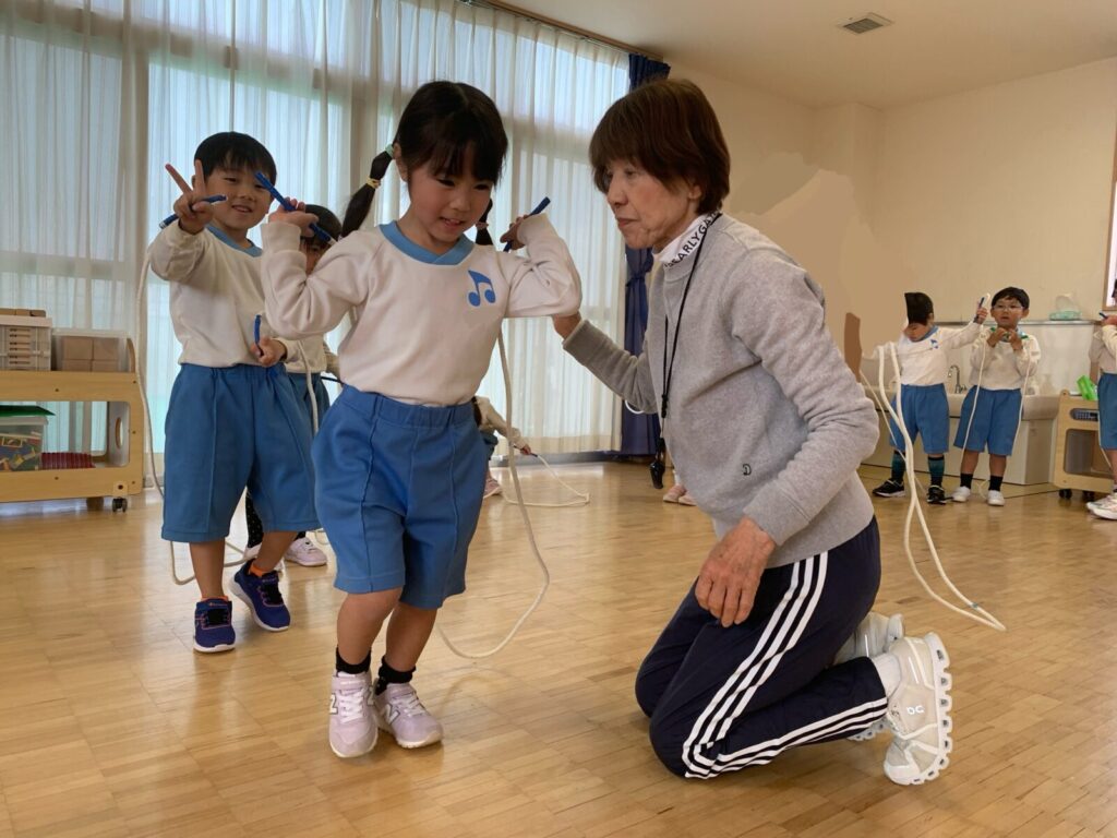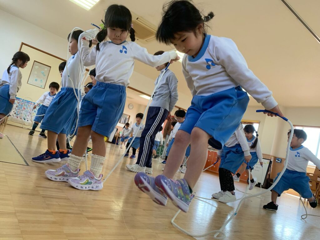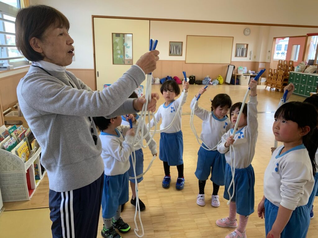最初はゆっくり縄をまわし、跳び越える練習をしました!