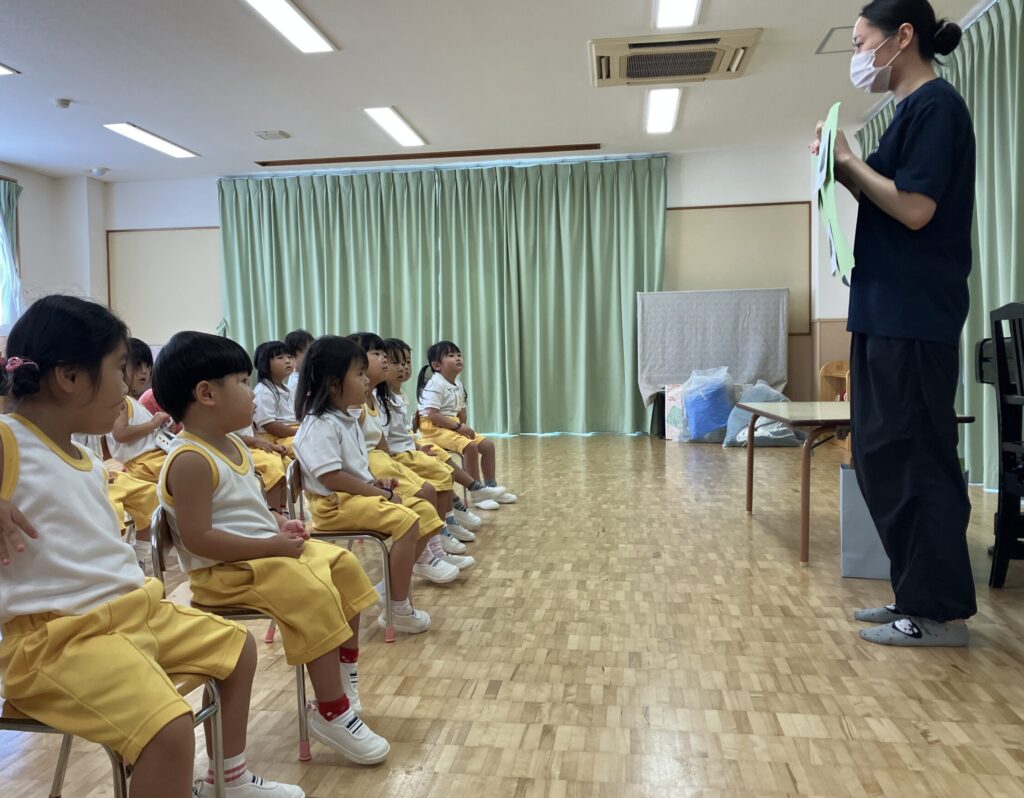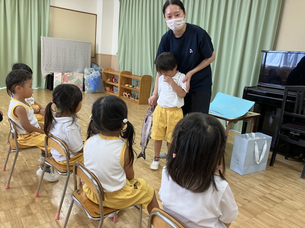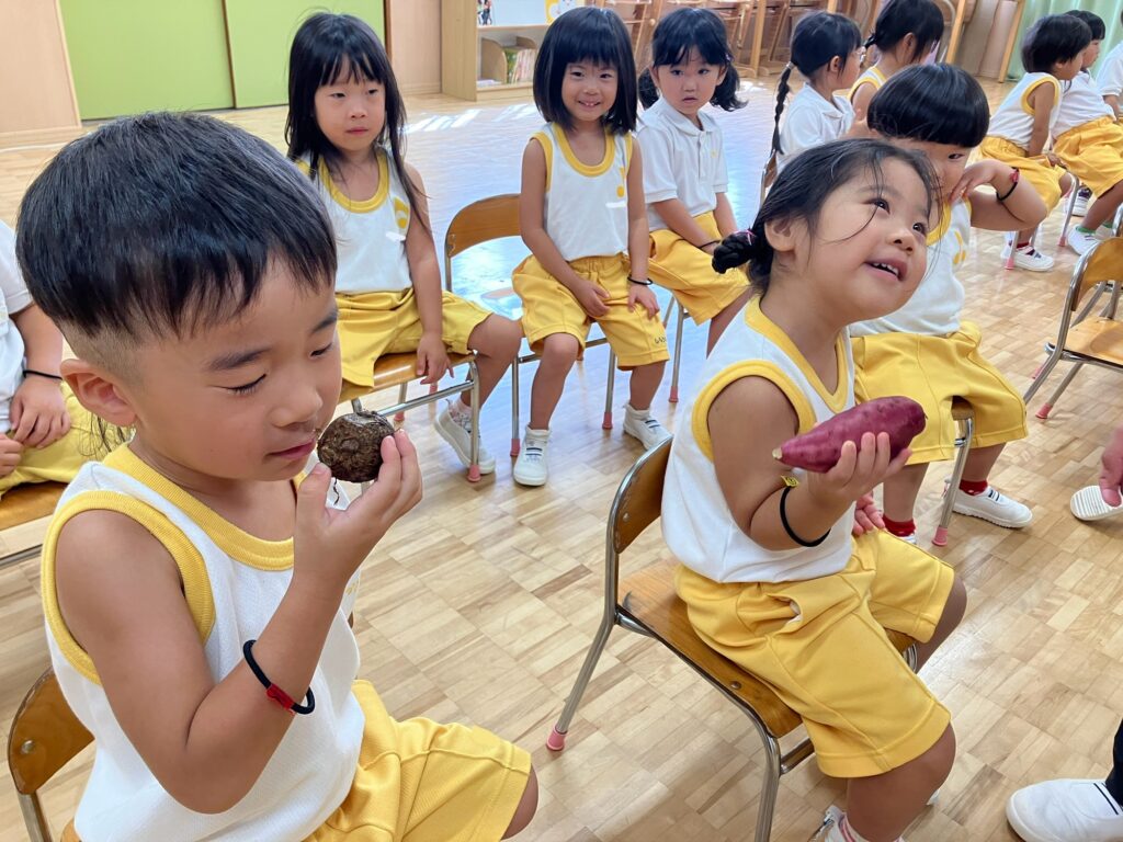 食育のお話では、秋の旬の食べ物を教えてもらいました!実際に触ってみると硬さや匂いに興味を持っていたチェロさんです。
