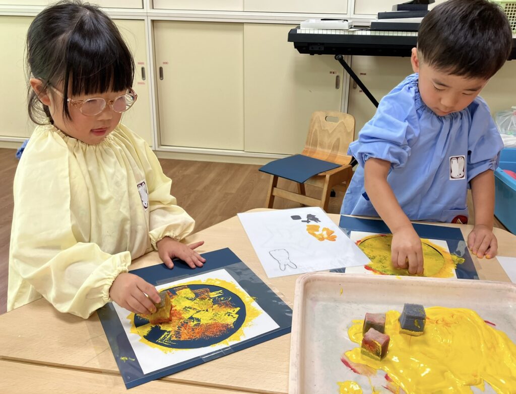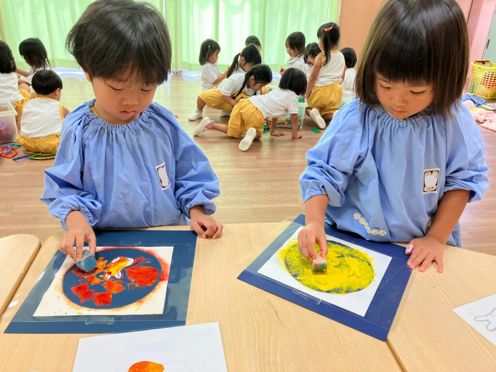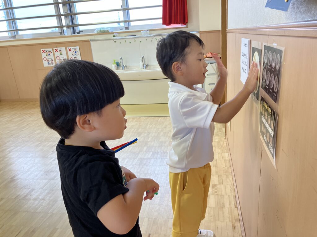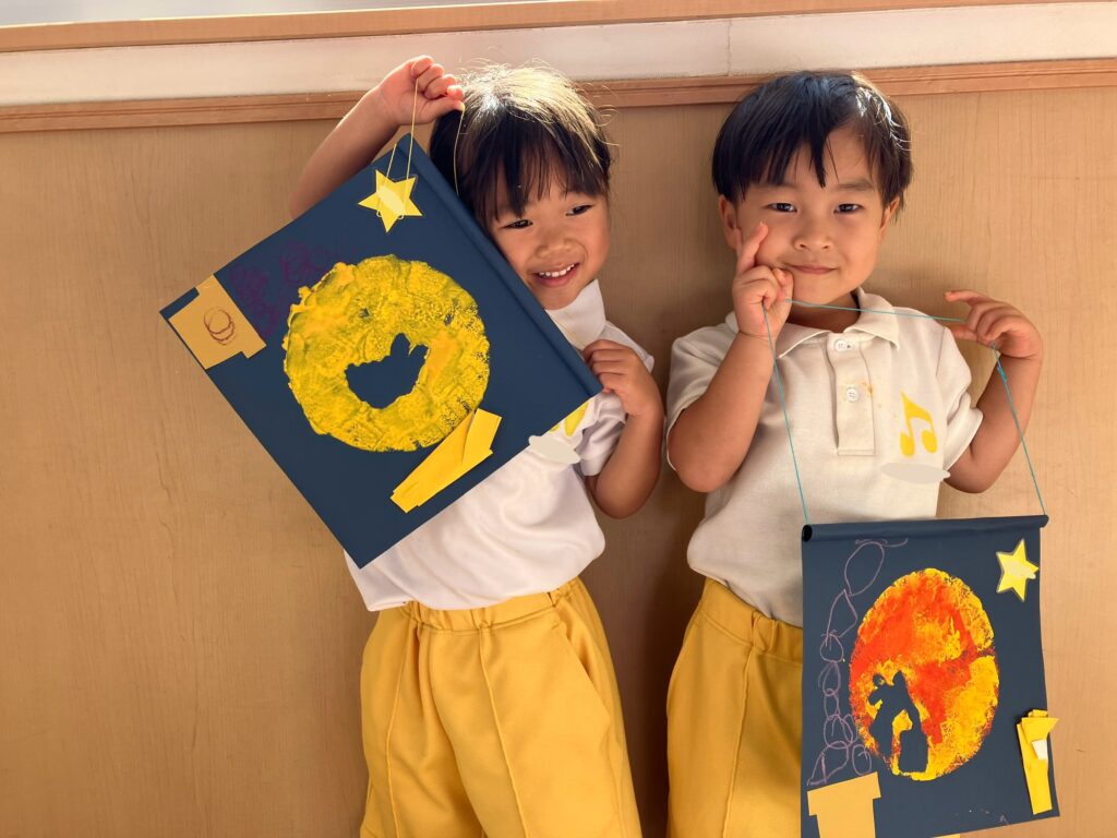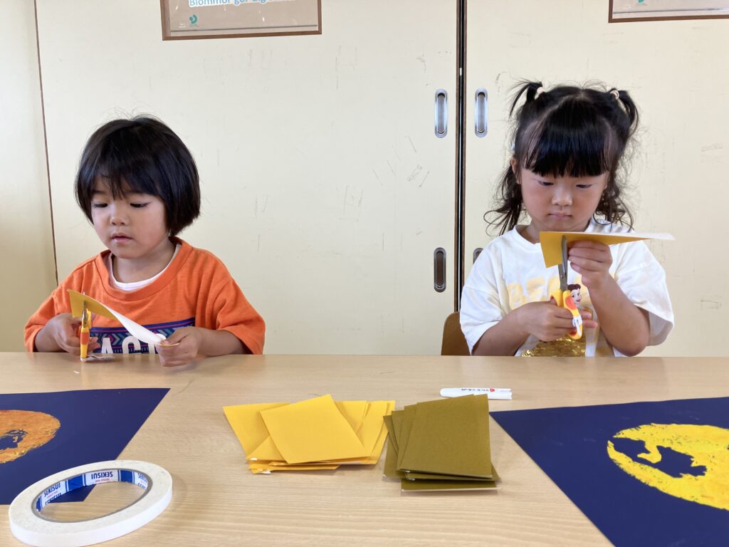 お月見製作は、お月見の絵本を見ると「月の中にはウサギがいるんだよ!」と教えてくれる子も多く、「おもちぺったんこってやってるね」と興味を持ち取り組んでいました。子どもたちが感じたお月様をぜひご覧ください♡