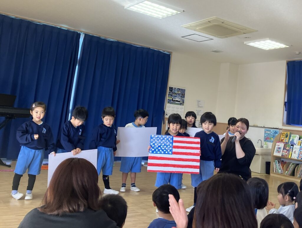 国旗のクイズを出すと「はーい!」と手を挙げて先生と一緒に「アメリカ!」と答えてくれましたよ!