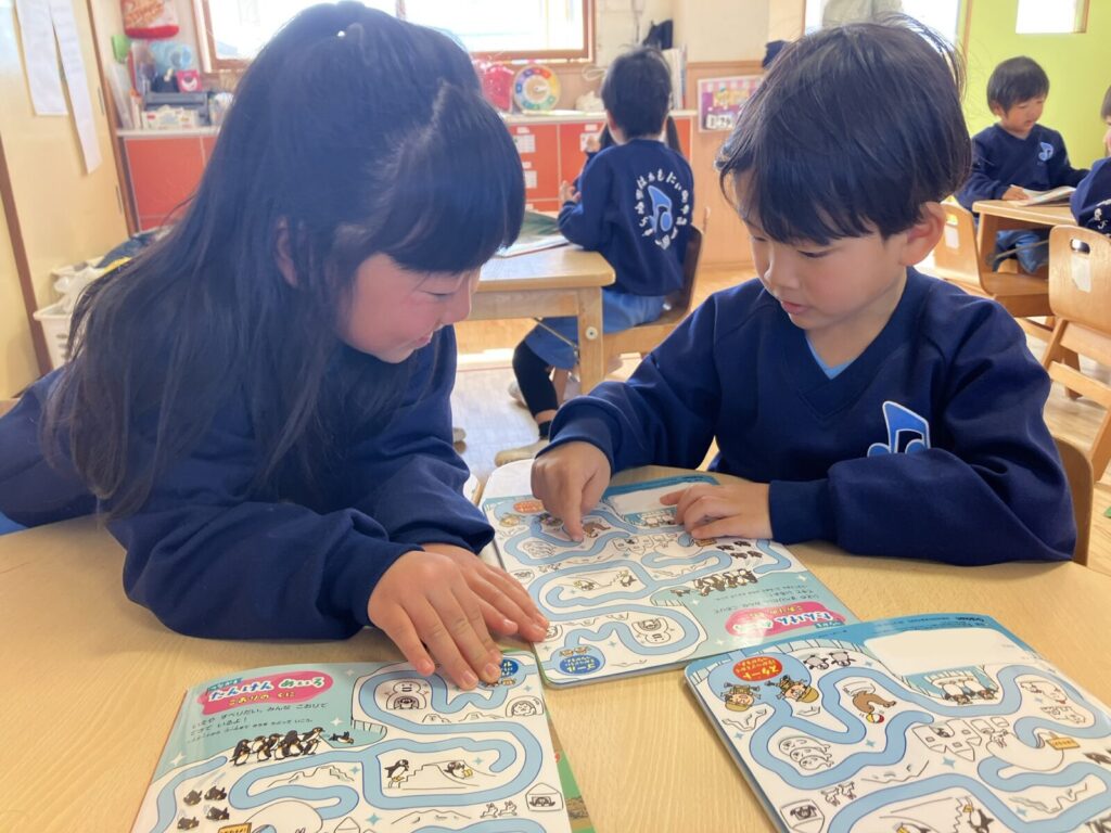 友達と絵本をくっつけて大きな迷路かんせ~い!「ゴールできるかな?」と楽しんでいましたよ😊✨