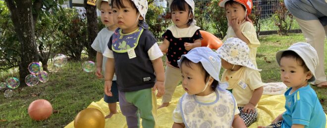 あじさいの花も色づき、梅雨の季節になりました。お散歩に行くとお花やちょうちょがいっぱい✨ これなあに?と色々な物に興味津々でジーっとみたり、指差しをして教えてくれます。天気が良い日も多く、お庭でも沢山遊びました。しゃぼん玉遊びが大好きなハープさんは、フワフワ~っと飛んでいくしゃぼん…